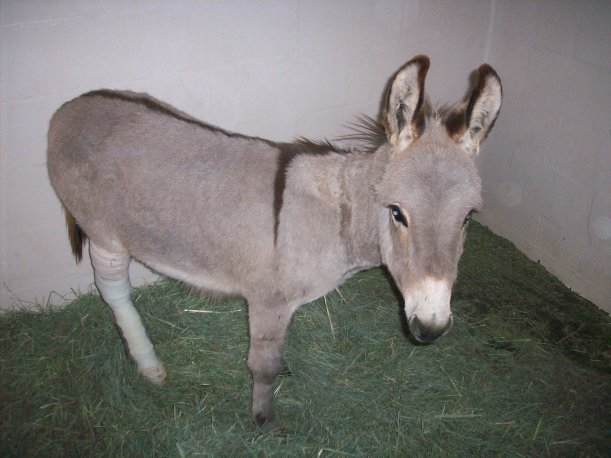 Boy George is an adorable 1-year-old miniature donkey who presented to Loomis Basin Equine Medical Center after being in the wrong place at the wrong time and getting stepped on by a full-sized adult horse. Boy George was seen in the field on emergency and was splinted (despite his disapproval of the plan) and brought to the clinic for further assessment. At the clinic, x-rays were taken of his right hind leg which confirmed a significant fracture of his cannon bone.